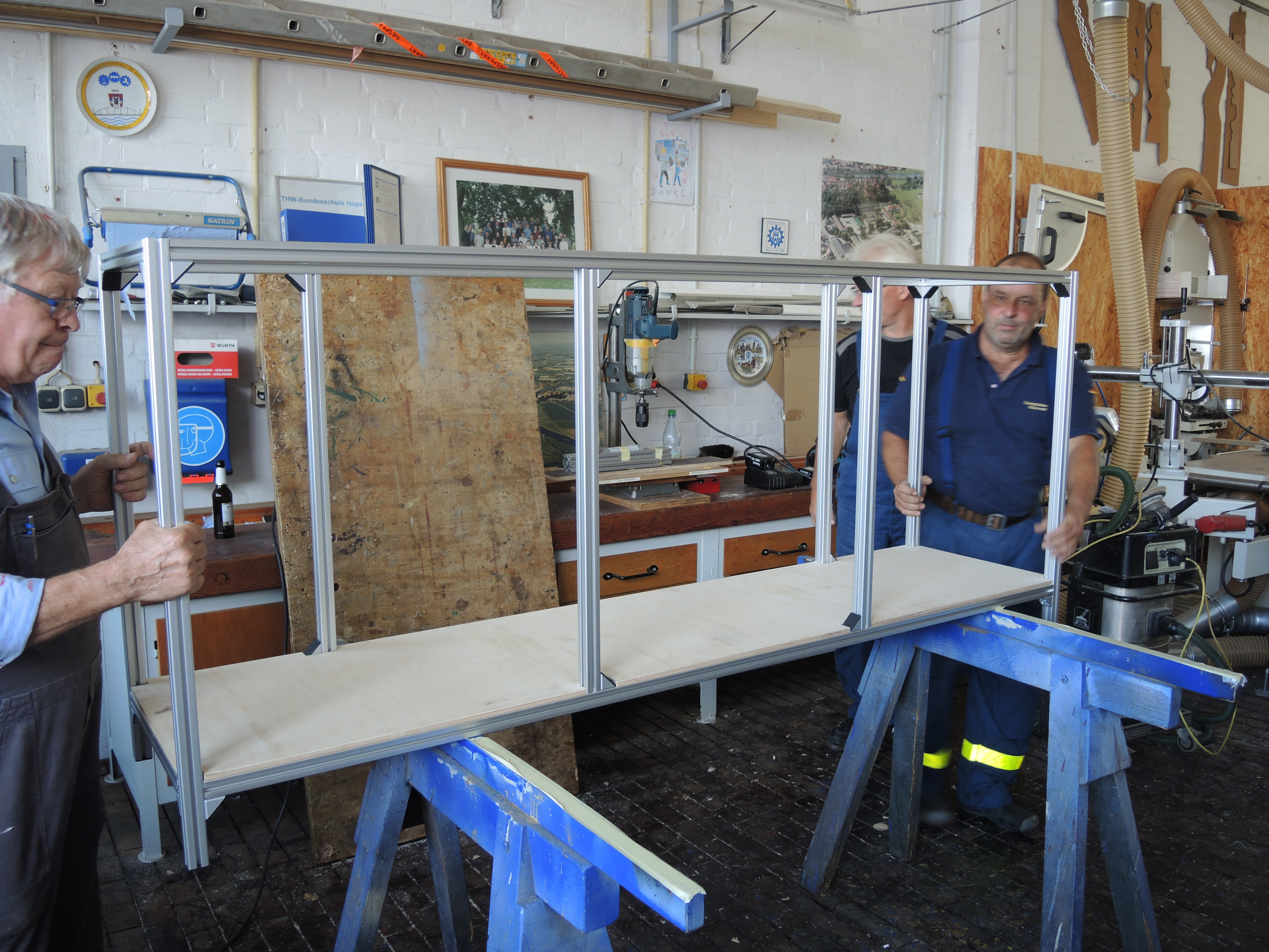 Vor einiger Zeit haben Rudi Heppe und Dietmar Schrötter sich vorgenommen, für die Teilnahme an Ausstellungen, wie z.B. die RetroClassic, einen Tisch, auf dem wir unser Werbematerial, Flyer usw. auslegen und in dem wir abends das Material einschließen können, zu bauen.
