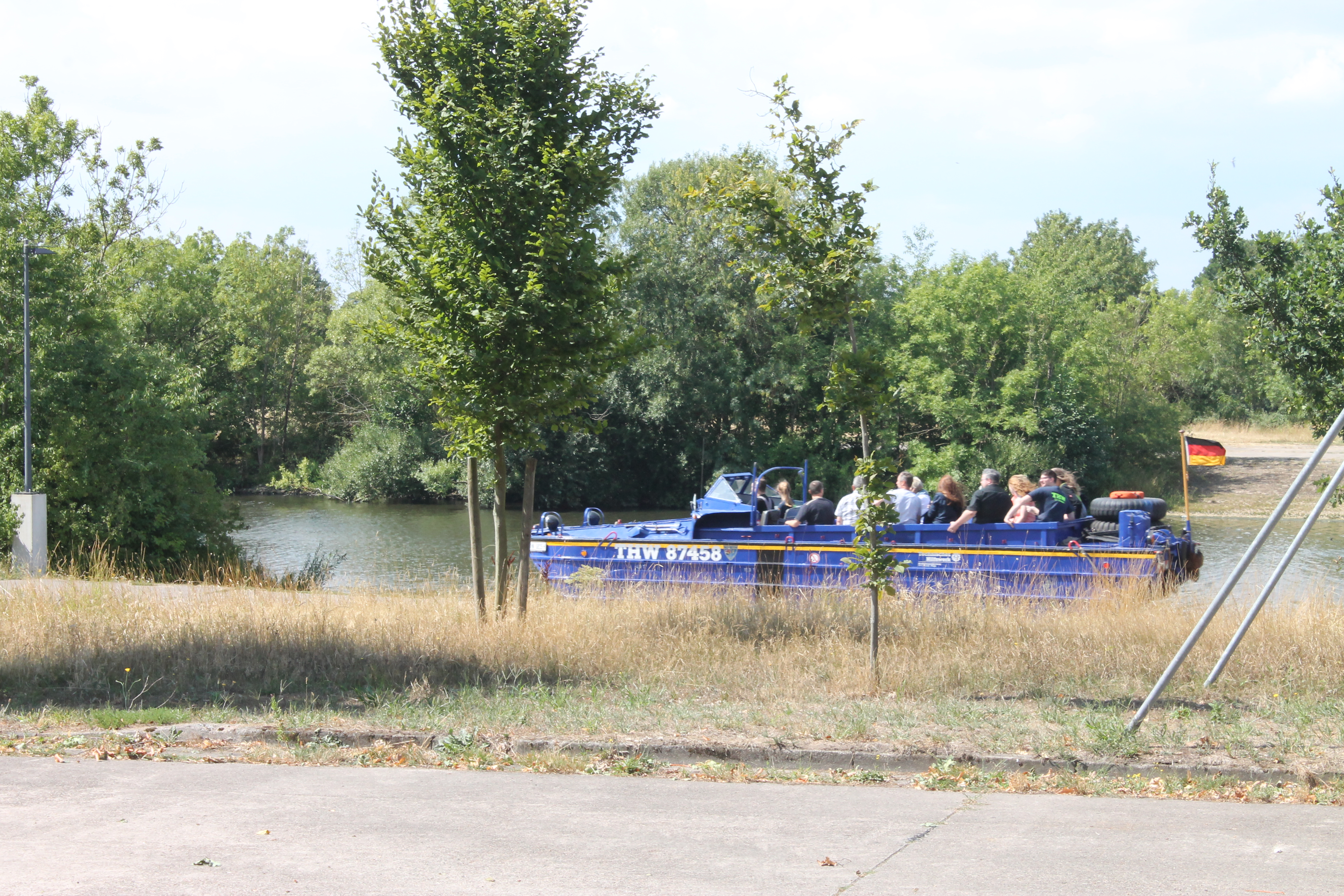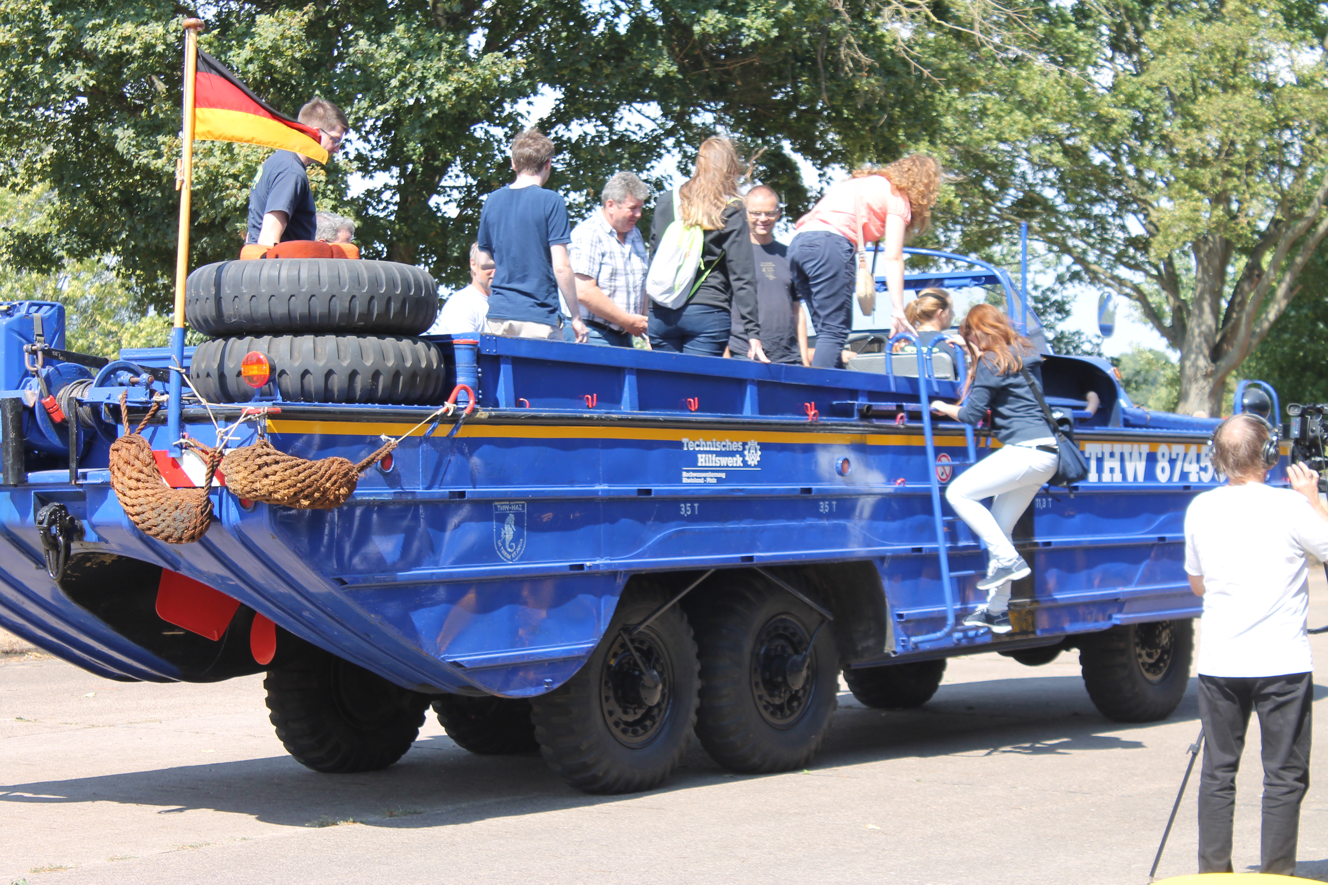 Am Nachmittag wurde der Dukw aus der Halle herausgefahren, die Teilnehmer an der Führung sind eingestiegen. Die Fahrt des Dukw ging an der Weser entlang, an den Hallen vorbei bis hin zur Lehrsammlung, dabei wurde gefilmt.