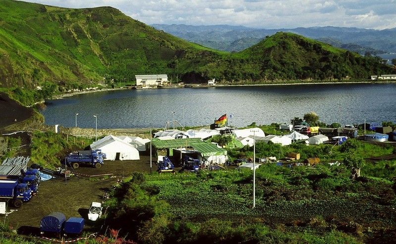 Das Basislager des Technische Hilfswerkes am Hafen von Goma, direkt am Kivusee. Von dort starteten die LKW des THW, erfolgte die Wartung und Instandsetzung von Fahrzeugen und Equipment in der Schirrmeisterei, schliefen die Helferinnen und Helfer in Zelten, wurde das umfangreiche Material gelagert und die Einsatzkräfte versorgt. Große Industriewaschmaschinen und einheimische Kräfte sorgten für saubere Arbeitskleidung. Am Kivusee wurden die Trinkwasseraufbereitungsanlagen aufgebaut und mit Pumpen das Rohwasser aus dem See entnommen, aufbereitet, chloriert, gesammelt, in Rohrleitungen auf den Wasserturm gepumpt und an die Tankfahrzeuge abgegeben.