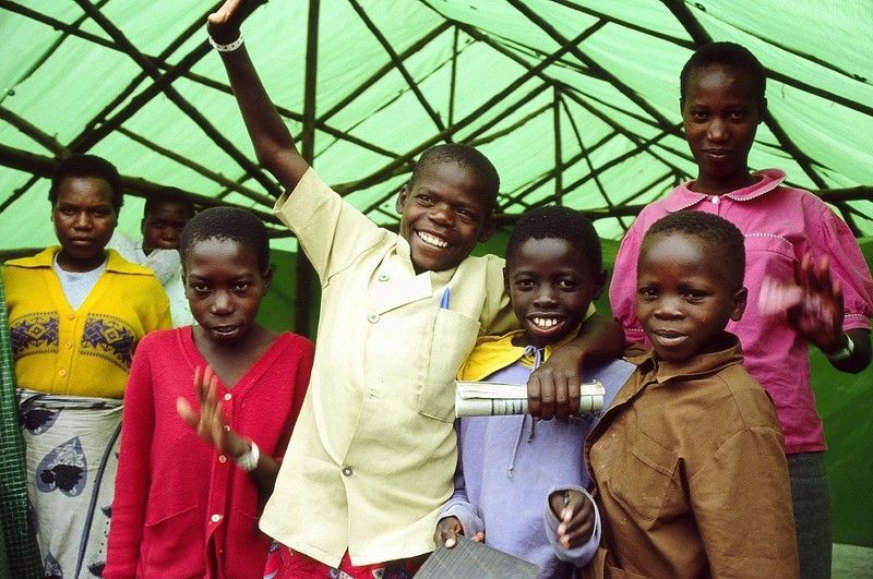 Kinder Goma: Hallo Muzungu – trotz der bedrückenden Lebenssituation in den Flüchtlingslagern hatten die Kinder immer Spaß, wenn die Muzungus (afrikanische Bezeichnung für hellhäutige Menschen) in ihren hellblauen Outfits mit den hellblauen LKWs kamen, frisches Trinkwasser lieferten und so für Abwechslung im eintönigen Lageralltag sorgten.