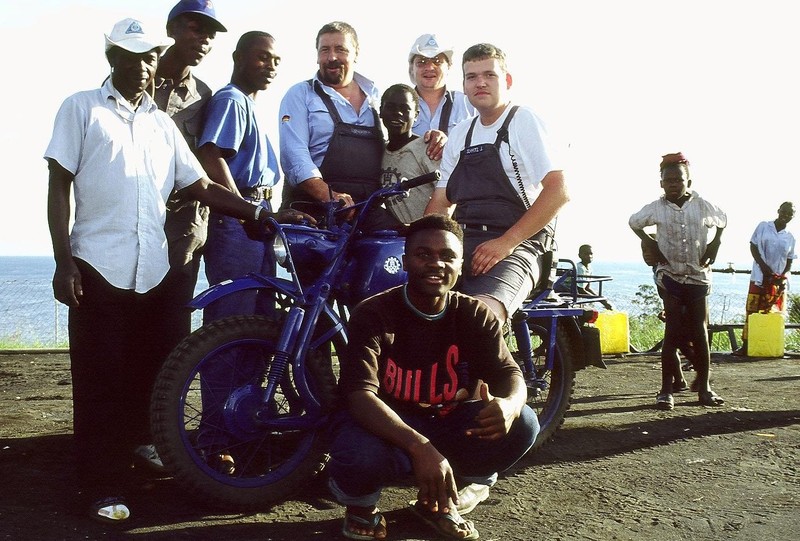 THW-Helfer mit lokalen Kräften – Lokale Hilfskräfte und THW-Einsatzkräfte arbeiteten eng zusammen. Zur umfangreichen Ausstattung gehörte auch ein geländegängiges Krad.