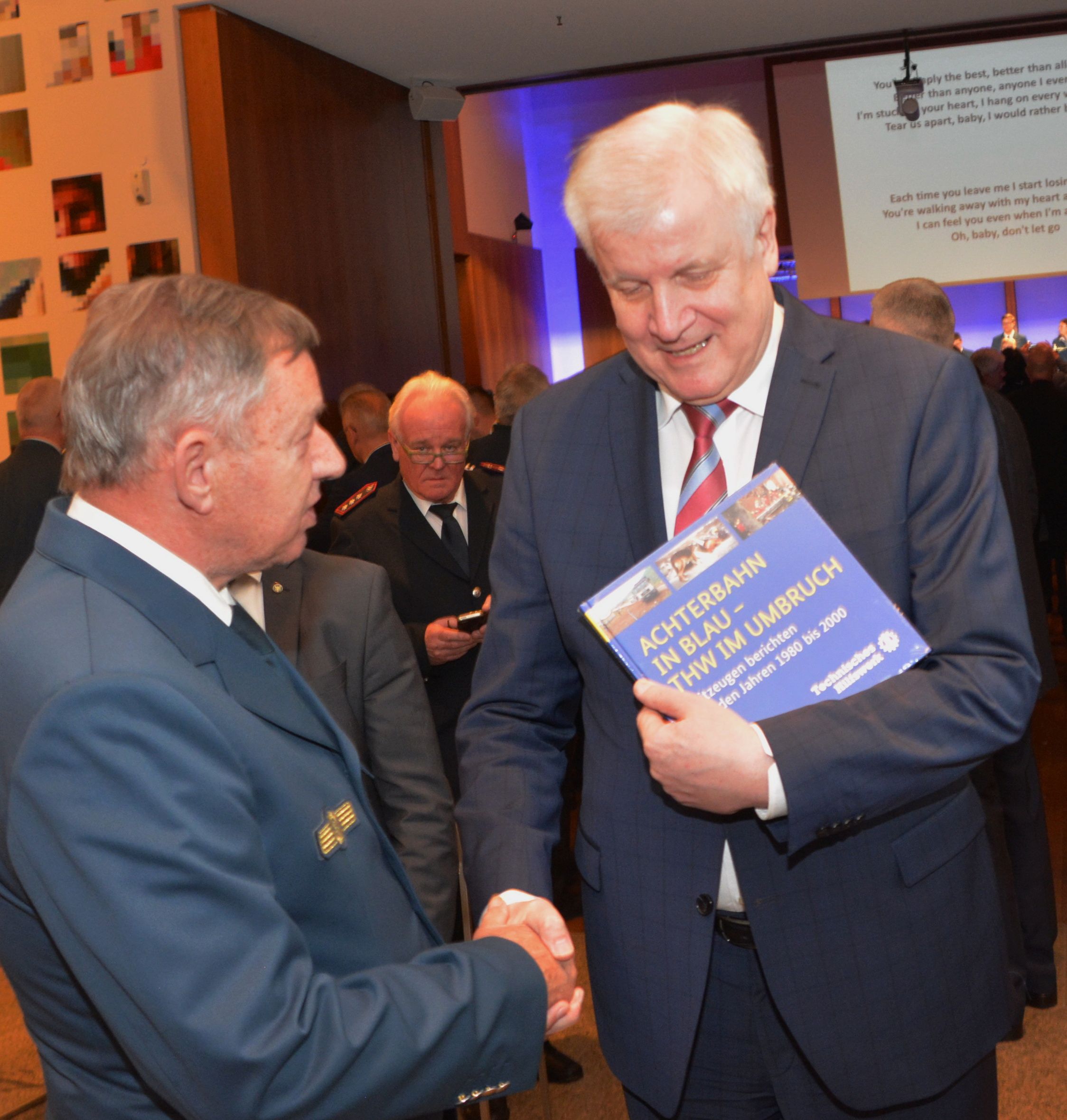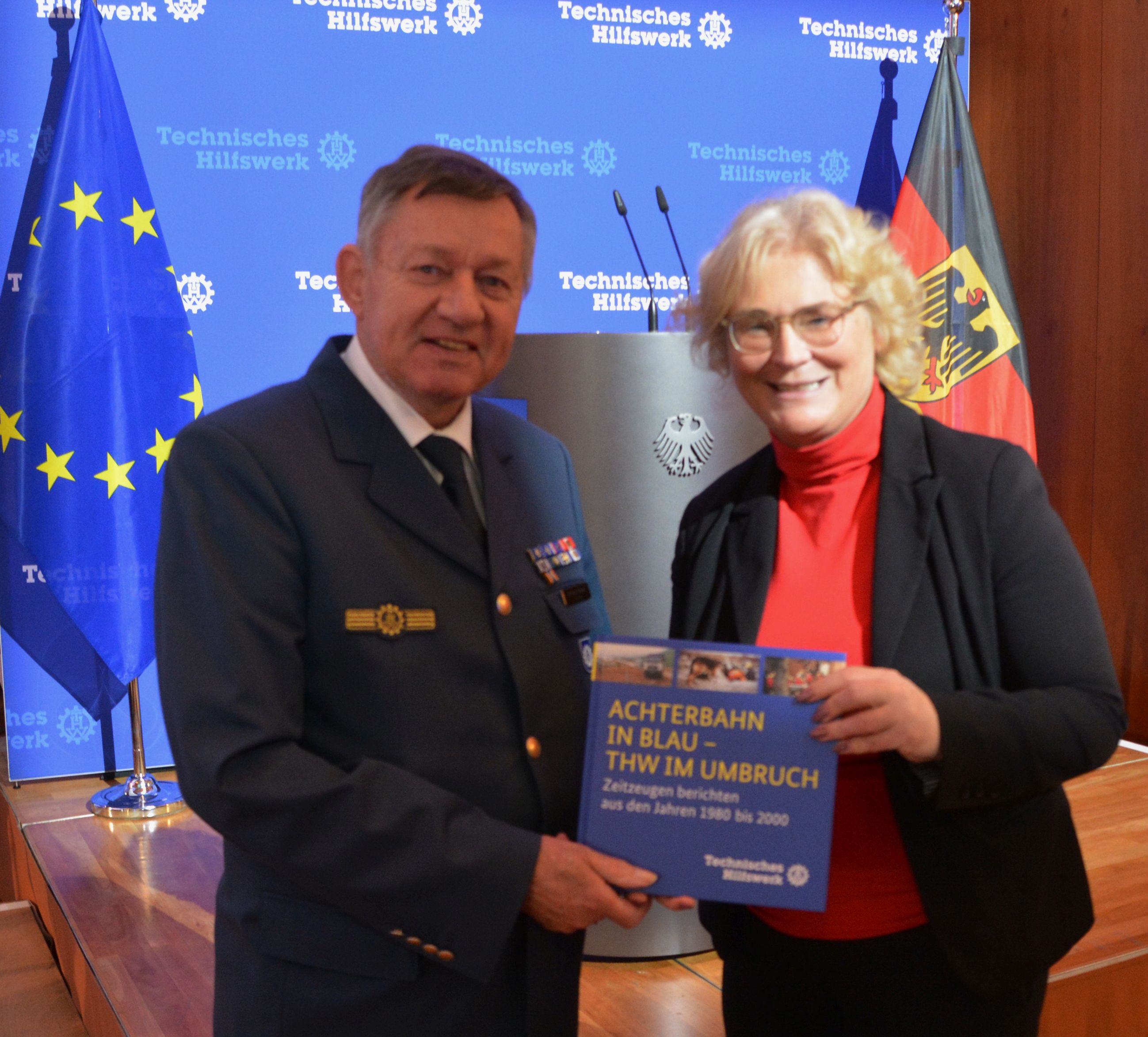 Das Buch „Achterbahn in Blau – THW im Umbruch“ der THW-historischen Sammlung sollte auch bei der Abschiedsveranstaltung in Berlin verteilt werden. Der Beauftragte der THWhS für Nordrhein-Westfalen, Helmut Kellner, übernahm diese Aufgabe und verteilte, gemeinsam mit netten Mitarbeiterinnen der Berliner LB-Dienststelle, die Bücher an interessierte Teilnehmer beim Verlassen der Veranstaltung.