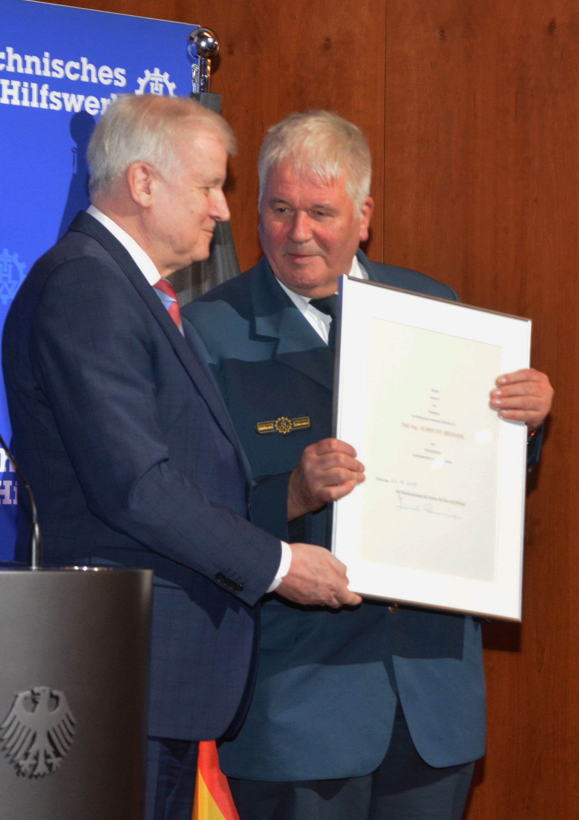 Bundesinnenminister Horst Seehofer dankte in einer sehr persönlichen Rede dem scheidenden Präsidenten für 13 Jahre beachtenswerte Arbeit im THW und überreichte die offizielle „Entlassungsurkunde“. Anschließend ernannte er ihn, ebenfalls mit einer Urkunde, zum Ehrenpräsidenten des THW.