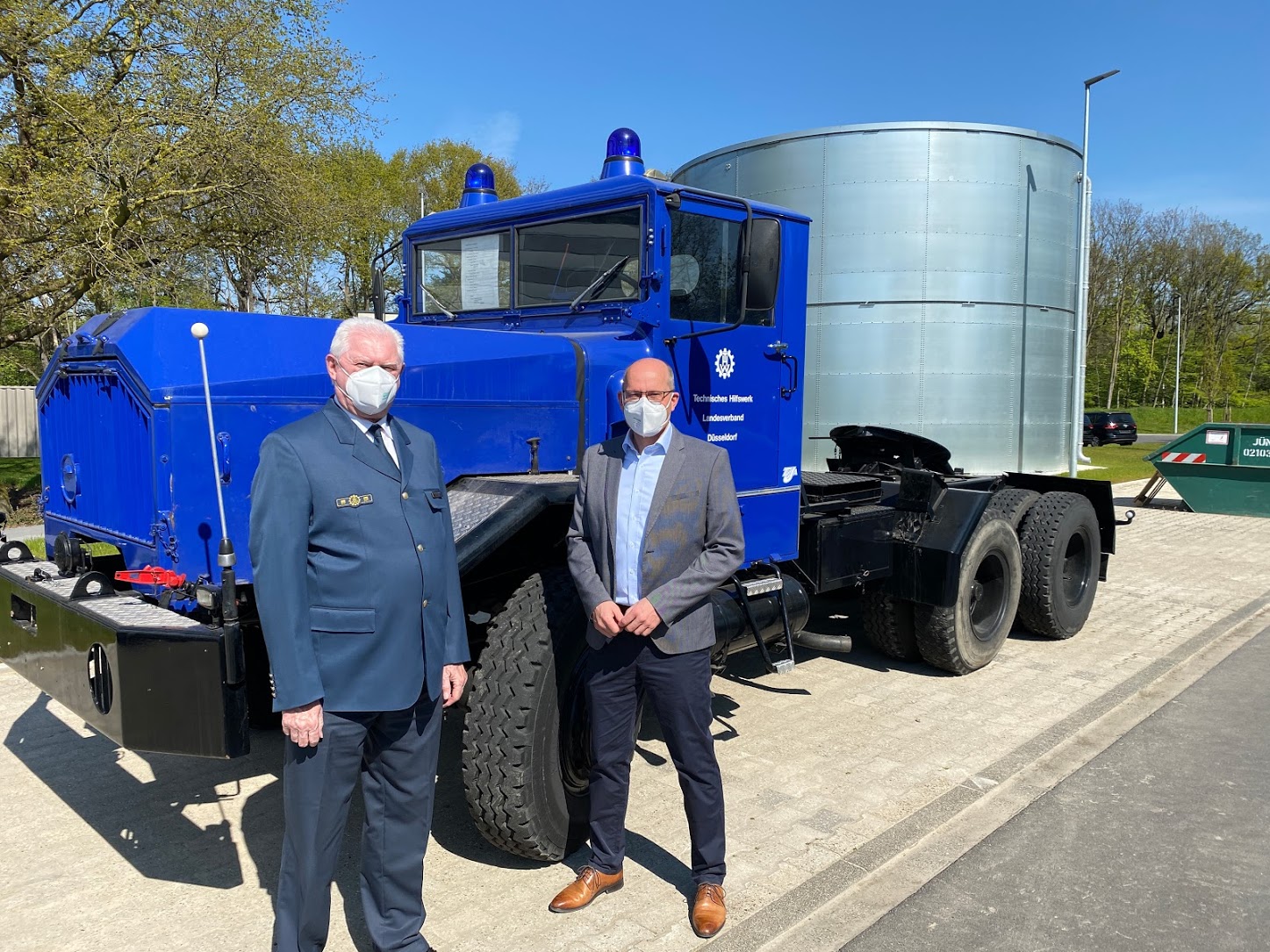 Landesbeauftragter Dr. Schliwienski bat beide zum Erinnerungsfoto mit der Historischen Faun-Sattelzugmaschine, die in Hilden für die THW-historische Sammlung fahrtüchtig abgestellt ist.