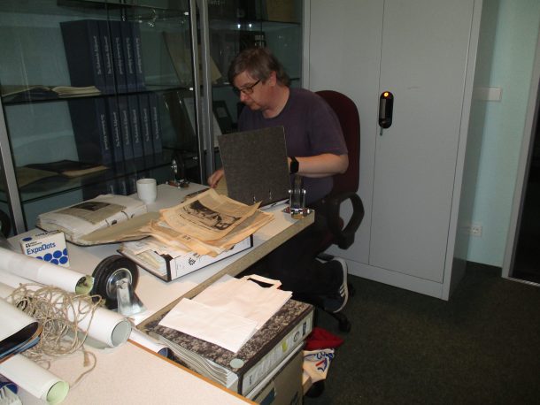 Alte Zeitungsartikel über Einsätze und Berichte des THW wurden den Ortsverbänden zugeordnet und abgeheftet.