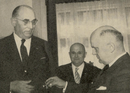 LB Dipl.-Ing. Friedrich Schmid (links) würdigt im 1964 im OV Günzburg die Helfer Willy Hilpert, Willi Eisen und Adolf Schäftler