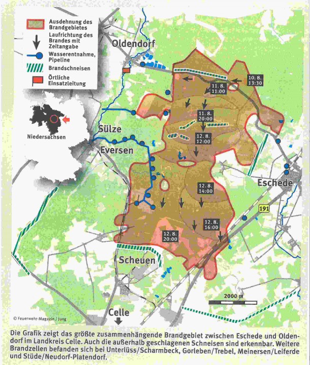 Ein sogenannter „Jahrhundertbrand “ in den heißen Augusttagen des Jahres 1975 stellte den THW-Landesverband Niedersachsen vor seine wohl größte Bewährungsprobe seit seinem Bestehen. Insgesamt 15.000 Helfer von Bundeswehr, Bundesgrenzschutz, Einheiten des Katastrophenschutzes , Bereitschaftspolizei und englische Soldaten versuchten in knapp zweiwöchigem Einsatz des Großfeuers, das insgesamt über 8.000 Hektar Wald im östlichen Niedersachsen vernichtete, Herr zu werden.