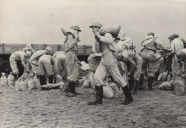 Mit dem nassen Element hatten es niedersächsische Helfer auch zum Jahresende 1954 wieder zu tun. 300 Helfer wurden an der ostfriesischen Küste zur Deichsicherung eingesetzt.