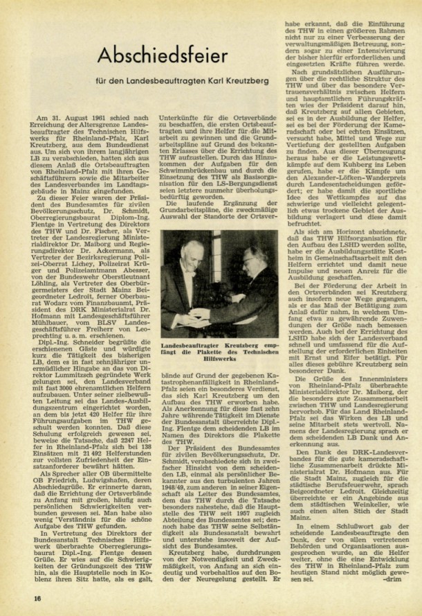Zunächst als Mitarbeiter in der THW- HauptsteIle in Koblenz tätig, wurde Karl Kreutzberg zum ersten Landesbeauftragten für Rheinland-Pfalz ernannt und hat dieses Amt bis zu seiner Pensionierung am 31. August 1961 mit großer Einsatzbereitschaft und mit dem ihm eigenen Verantwortungsbewußtsein für die Gemeinschaft wahrgenommen.
