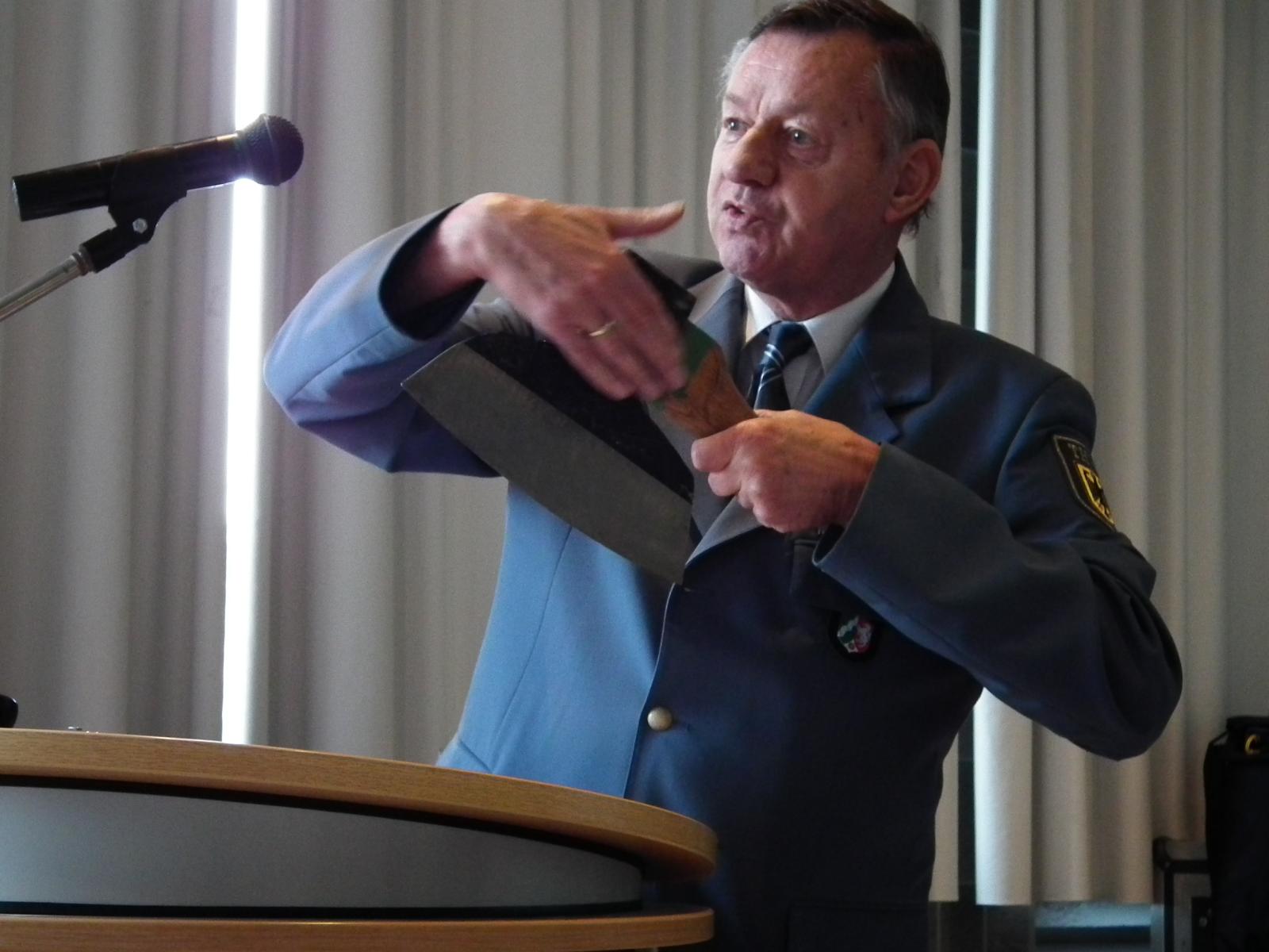 Mit diesem Beil zum Entasten von Baumstämmen aus dem Gerätesatz Waldlagerbau von 1955 begann Helmut Kellner seine Vorstellung über Struktur und Aufbau der THWhS. NRW-Landesbeauftragter Dr. Schliwienski bat den Beauftragten der THWhS für NRW auf der diesjährigen Tagung der Orts-und Kreisbeauftragten den Teilnehmern die Arbeit der THWhS erstmalig zu erläutern. Vor 1oo OB/KB, allen Geschäftsführern und hauptamtlichen Mitarbeitern der LB-Dienststelle berichtete H. Keller über die...